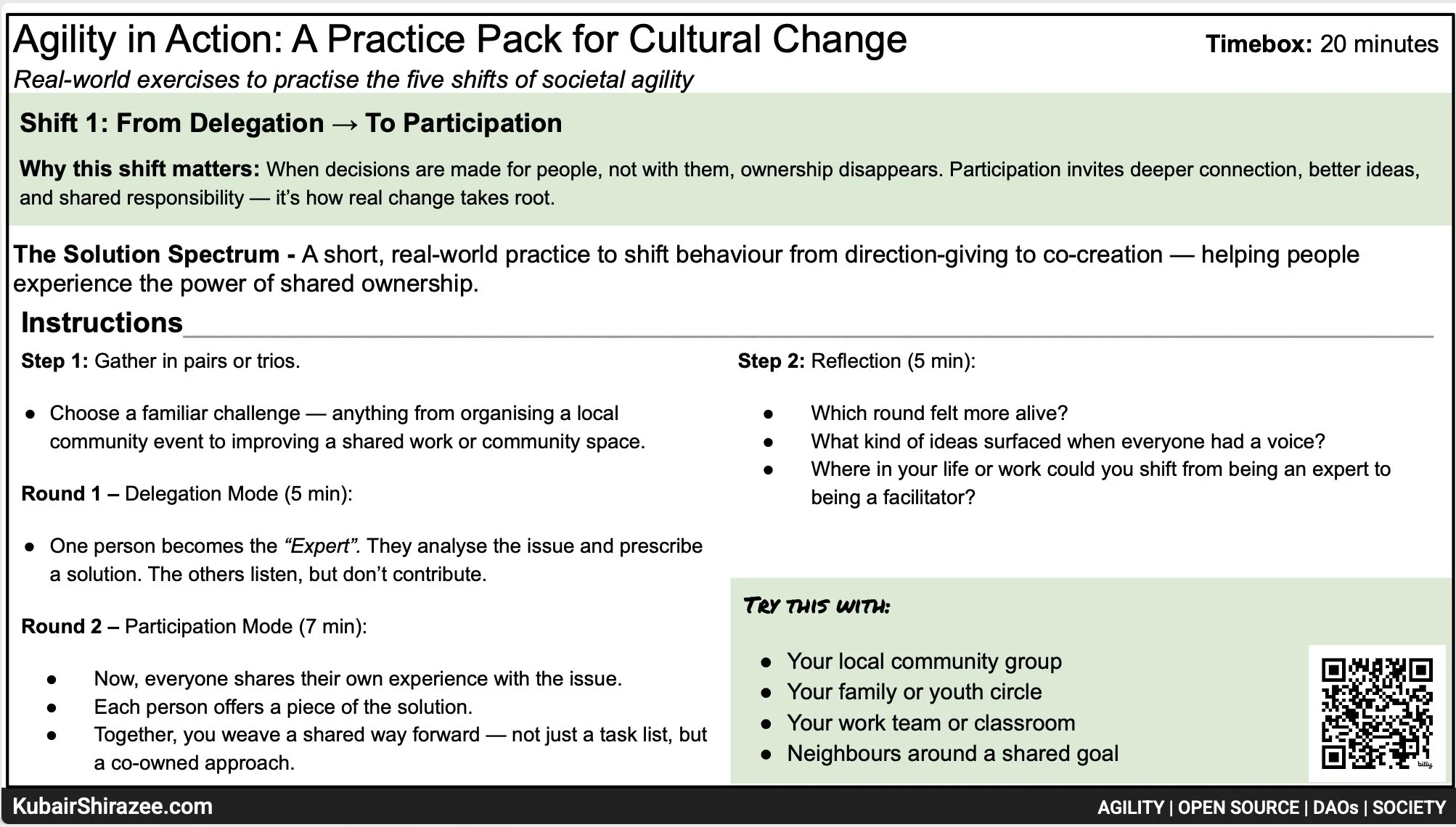 Each one of the five shift exercises is designed to be accessible, real, and adaptable, because agility doesn’t start in the boardroom. It starts in how we gather, how we co-create, and how we grow together.