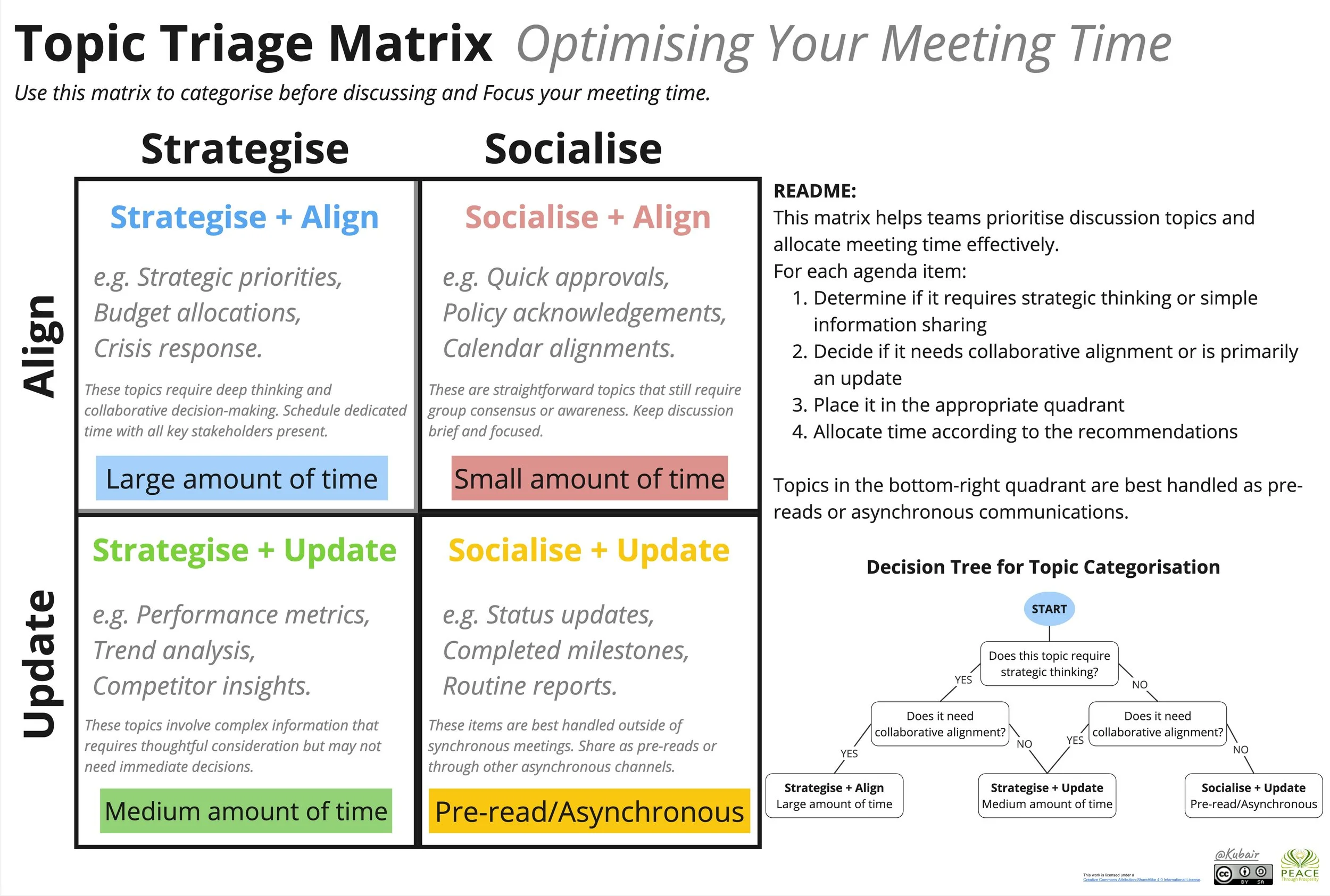 The Topic Triage Matrix is a powerful visual framework that helps teams prioritise discussion topics and allocate meeting time more effectively. By categorising agenda items based on two key dimensions—whether they require strategic thinking or simple information sharing, and whether they need collaborative alignment or are primarily updates—teams can make better decisions about how to structure their meetings and respect everyone's time.